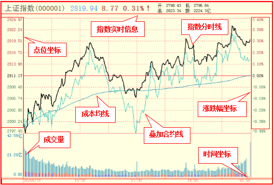 坐标组成:纵轴,由图形两侧的指数点位,和涨跌幅组成。横轴,由图形底部的当日时间组成。