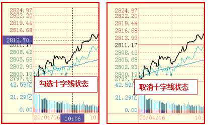 十字线:勾选“十字线”,鼠标在分时图上滑动时,会以鼠标位置为中心,延伸出两条垂直相交的虚线,便于比较分时图上不同点位的相对位置。取消“十字线”,则鼠标在分时图上滑动时,不显示任何辅助线。