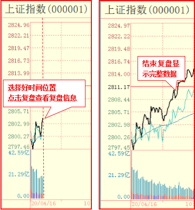 复盘/结束复盘:在历史分时的任意位置定位光标,选择复盘,图形和指标恢复到定位时间的数据信息,借宿复盘,还原到完整数据信息。