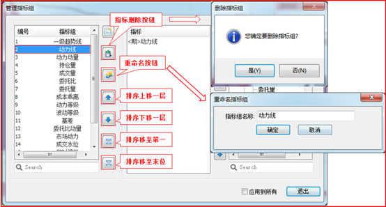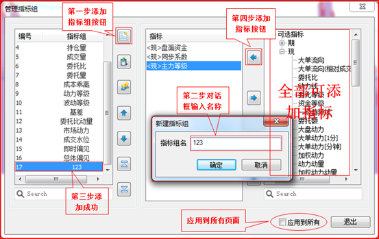 D、管理指标组按钮:在此界面可以添加指标、建立指标组,具体请参看下面信息,强调一下:点击“应用到所有” 那么串列、并列、同列界面的指标组就会按照单列界面的设置内容设置好,不需要用户再重复设置,使您操作更为便利。