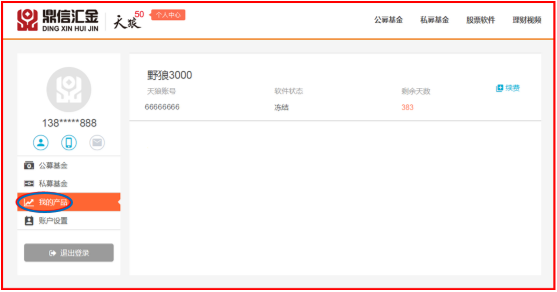 第四步:登录后点击我的产品,查看产品账号、状态和剩余天数。