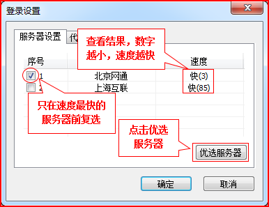 第二步:在设置界面点击优选服务器,查看速度,单独选择速度最快的服务器。
