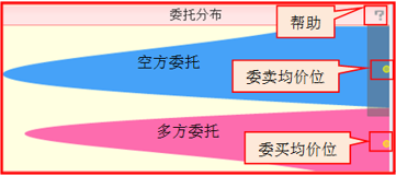 委托分布以直观的形态反映市场委托情况。红峰表示多方的委托,黄色的点为委托买入均价在买入委托报价中的位置;蓝峰表示空方的委托,黄色的点为委托卖出均价在卖出委托报价中的位置。委托分布中有一块灰色区域,表示的是可见委托区域,即可在“委托报价”窗口看到的报单情况。