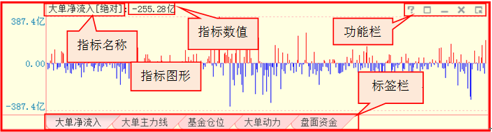 指标栏:指标栏由指标名称、指标参数、指标图形、功能栏和标签栏组成。其中功能栏包含,指标帮助、最大化、最小化、关闭、设置。点击功能栏中的