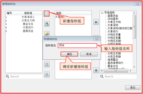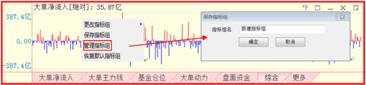 选择“保存指标组”,将弹出“保存指标组”窗口,可以将指标区当前显示的指标保存为一个新的指标组
