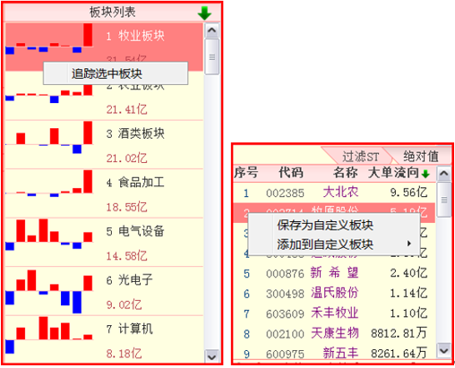 板块列表下方显示所选板块的个股信息,包含序号、代码、大单/主力线/资金流向、的数据信息和排序功能,在个股上右键单击鼠标时可将所选个股保存/添加到自定义板块。