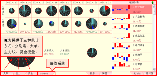 资金统计方式,以资金流量数据为基础对魔方进行统计计算,反映了市场整体资金流入流出情况,用于把握资和追踪资金的长期动向。(选择资金统计方式时,股票列表不能过滤ST)。