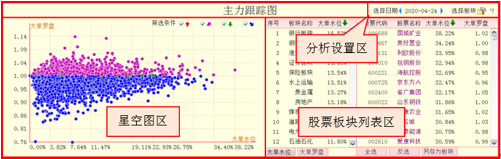 主力跟踪图由分析设置区、星空图区和板块股票列表区三部分组成。