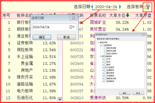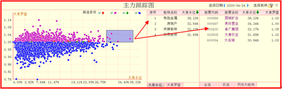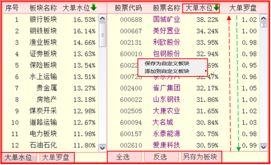 按住鼠标左键或右键在散点图中拖动,出现蓝色区域,所框选中的个股会出现在右侧的板块和股票列表中,列表中包含的信息有,序号、板块名称、大单水位、大单罗盘 个股名称,点击名称可以对股票进行升序或降序排序,以便分析,保存或添加到自定义板块。