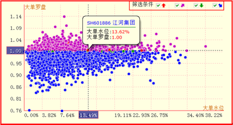 将鼠标定位的圆点上方,会提示该股的名称、代码、大单水位、大单罗盘信息。