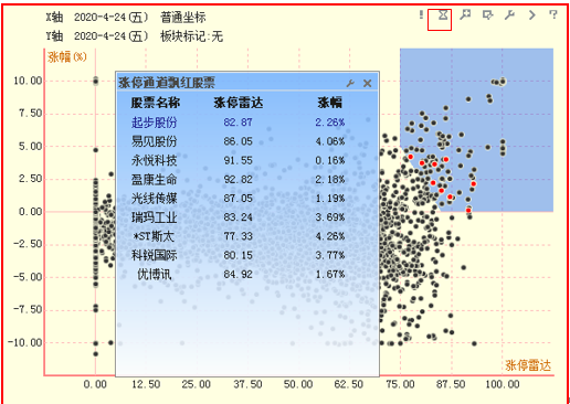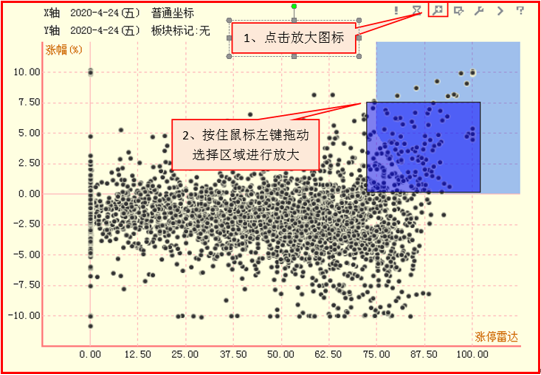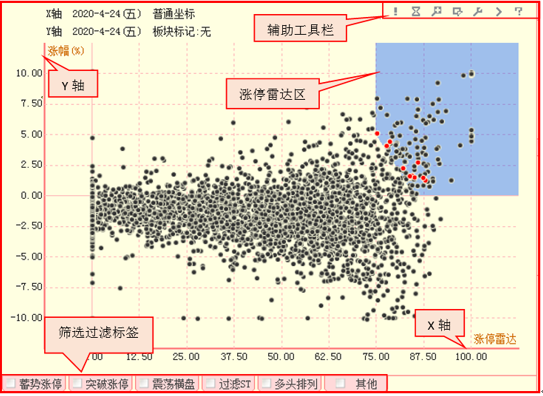 辅助工具栏:散点图区的右上角排列着一行工具图标,通过这些工具,可以实现散点图的局部放大、捕获特定股、筛选器设定等操作。