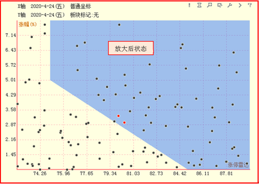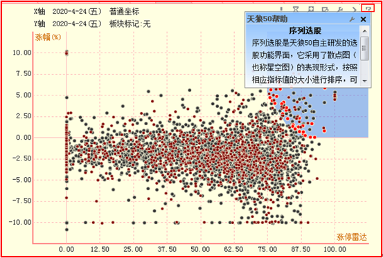 星空图又称散点图,像星星般散落在图中的圆点代表当前分析板块的所有股票。散点图的X轴和Y轴分别对应两个指标,并由这两个指标组成一个坐标系,可以根据个股在图形中的位置来进行区域性分析和筛选。默认条件下X轴是涨停雷达,Y轴是涨幅。