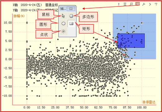 4、点击第四个图标,出现捕获工具,可以利用其捕获散点图中的股票。被捕获的股票在散点图中显示成淡蓝色圆点,并在板块解析区显示。捕获工具一共包括5种:鼠标、多边形、椭圆、矩形和点状。