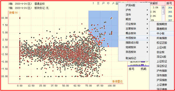 在下拉列表中选择“市场板块”,选择中小板,图中的中小板股个票显示为红色圆点。(板块标注的颜色是随机选取的)