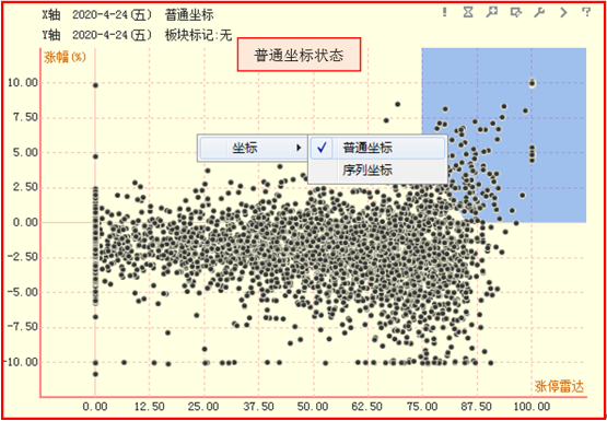 在星空图区域点击鼠标右键,会弹出坐标切换菜单,有“普通坐标”和“序列坐标”两个选项,软件默认显示普通坐标系下的散点图,即根据各股票的X、Y坐标值正常绘制各个点。