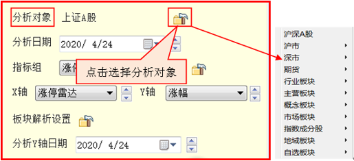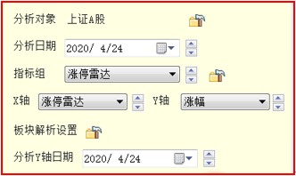 页面功能设置区在选股界面的右下方,通过功能设置可以自定义分析对象、分析日期、指标组及板块解析数量等分析条件。