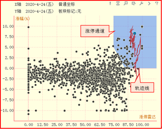 散点图中股票后面的红色曲线是轨迹线,它显示了从开盘至当前时刻、股票在涨停雷达中的运行轨迹。