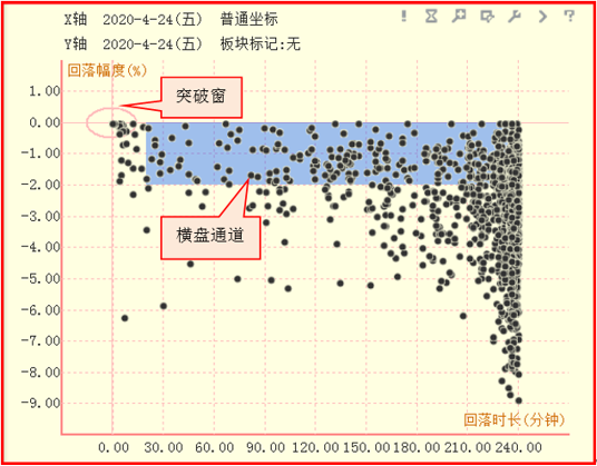 散点图中矩形的蓝色背景区是横盘通道。分时股价创新高后回落幅度在0至-2%之间的股票会落在这个区域。