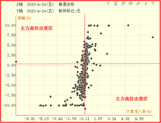 散点图被代表涨幅为0的线和代表大单流入率为0的线分为4个区域:在左上角的区域,大单流入率为负,涨幅为正,说明此时主力在高位出货;在右下角的区域,大单流入率为正,涨幅为负,说明此时主力在逢低买入。