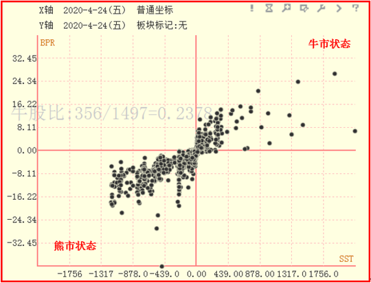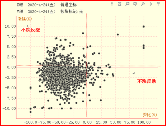 散点图被代表涨幅为0的线和代表委比为0的线分为4个区域:在左上角的区域,委比为负,涨幅为正,这个区域内的股票在空方占优的情况下,股价不跌反涨;在右下角的区域,委比为正,涨幅为负,这个区域内的股票在多方占优的情况下,股价不涨反跌,反映市场中多空力量的对比情况。
