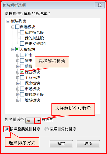 点击“板块解析设置”后的图标,将弹出“板块解析选项”窗口,在这里可以通过选择板块来设置参与解析的板块,选择解析股票个数以及板块排序规则。