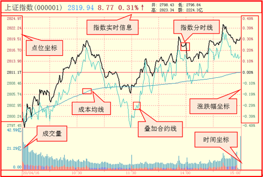 指数页面分时线由三条线组成:指数实时分时线、成本均线、叠加合约线(限天机版、野狼3000版)。