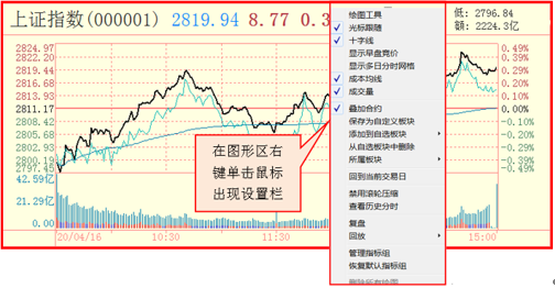 在图形区右键单击鼠标出现设置栏,可以通过对设置栏的调整,完成对指数实时行情信息图形中的,显示信息调整。