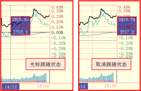 光标跟随:勾选光标跟随,指数实时信息会跟随光标显示在光标上方,取消光标跟随,指数实时信息会在图形右侧涨跌幅坐标位置显示。