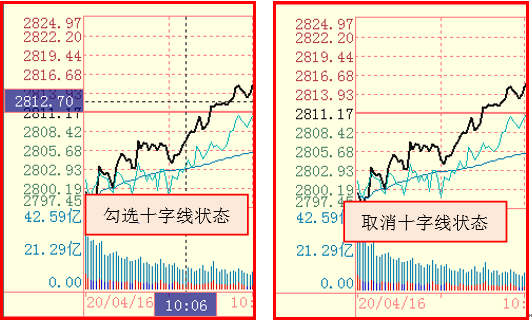 十字线:勾选“十字线”,鼠标在分时图上滑动时,会以鼠标位置为中心,延伸出两条垂直相交的虚线,便于比较分时图上不同点位的相对位置。取消“十字线”,则鼠标在分时图上滑动时,不显示任何辅助线。