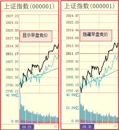 显示/隐藏早盘竞价 :显示早盘竞价,图形和指标中会显示:9:25——9:30分早盘竞价数据信息,隐藏则不显示,默认状态下是隐藏的。