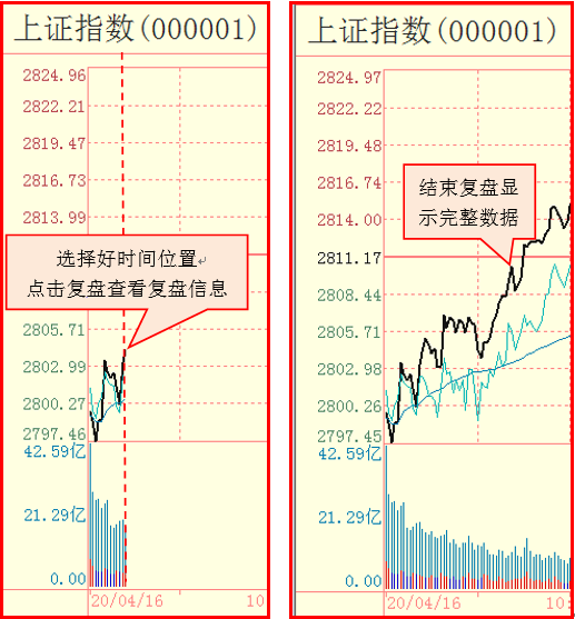 复盘/结束复盘:在历史分时的任意位置定位光标,选择复盘,图形和指标恢复到定位时间的数据信息,结束复盘,还原到完整数据信息。